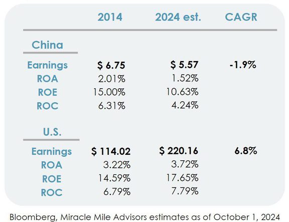 1. China’s underperformance is well supported by weak corporate fundamentals. In the last ten years, earnings of Chinese companies are down roughly 10% and measures of profitability/capital efficiency such as return on assets, return on equity, and return on capital have deteriorated meaningfully. Meanwhile, earnings for S&P 500 companies have doubled and the same measures of profitability/capital efficiency have improvement.